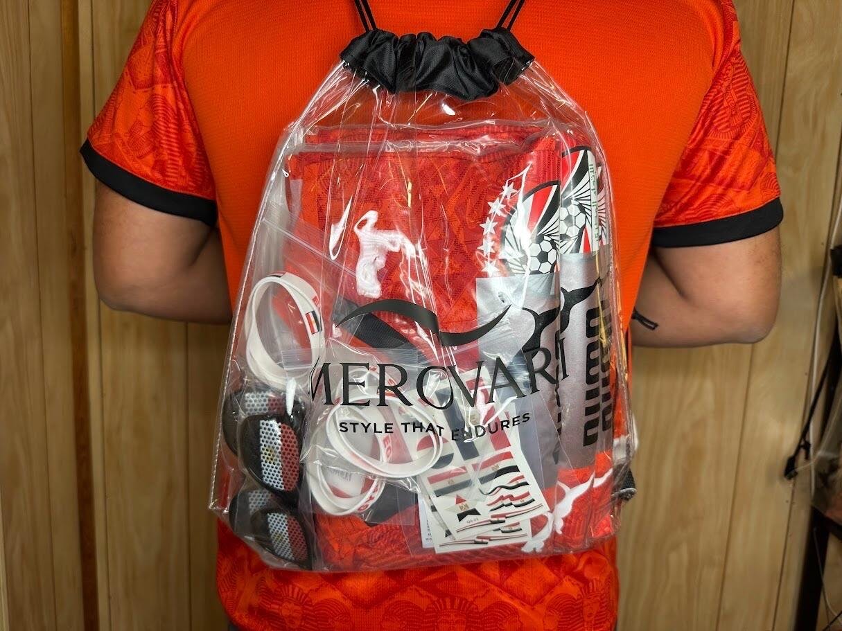Crafted from durable, high-clarity PVC with reinforced seams, the Merovari drawstring bag offers plenty of space for essentials like flags, accessories, snacks, and small personal items. The adjustable straps make it comfortable for all-day wear, while the clean, modern Merovari design keeps your look stylish and fan-ready.